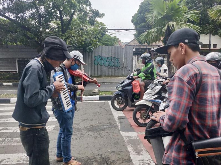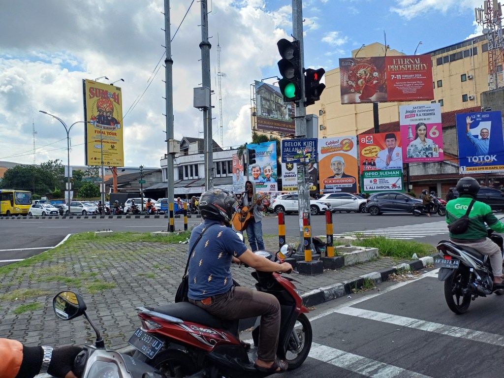 In Indonesië spelen straatmuzikanten muziek op drukke kruispunten of langs de straat en vragen ze geld aan motorrijders of autobestuurders. Als ik door het verkeer van Yogyakarta ga, kom ik heel vaak straatmuzikanten tegen. Sommige muzikanten hebben apparatuur zoals een microfoon en een versterker en hebben een helper om het geld te verzamelen. Andere muzikanten hebben minder professionele middelen. Op het centrale plein Alun Alun Kidul in Yogyakarta zag ik bijvoorbeeld een blinde muzikant die begeleid werd.