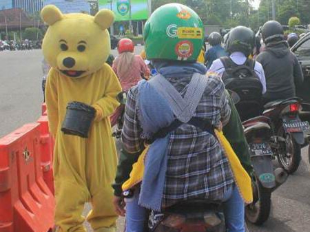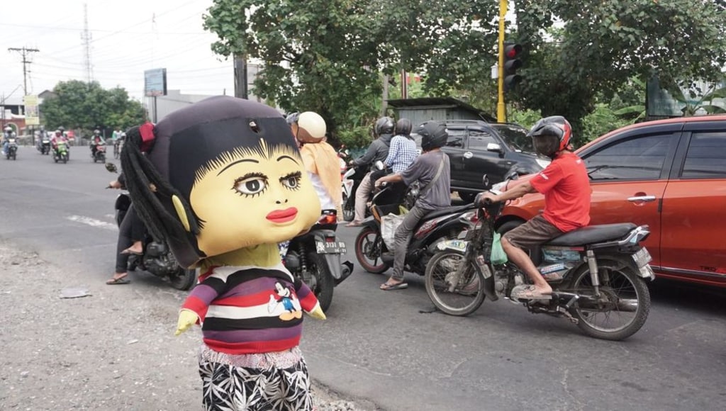 Sommige Indonesiërs verkleden zich in drukke straten in een kostuum van bijvoorbeeld cartoonfiguren en vragen geld aan autobestuurders en motorrijders, terwijl ze dansen. Dit zijn dus eigenlijk dansende bedelaars in een grappig kostuum.