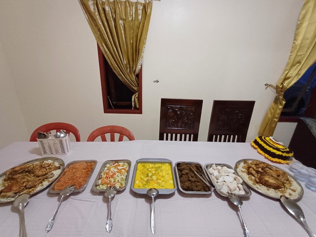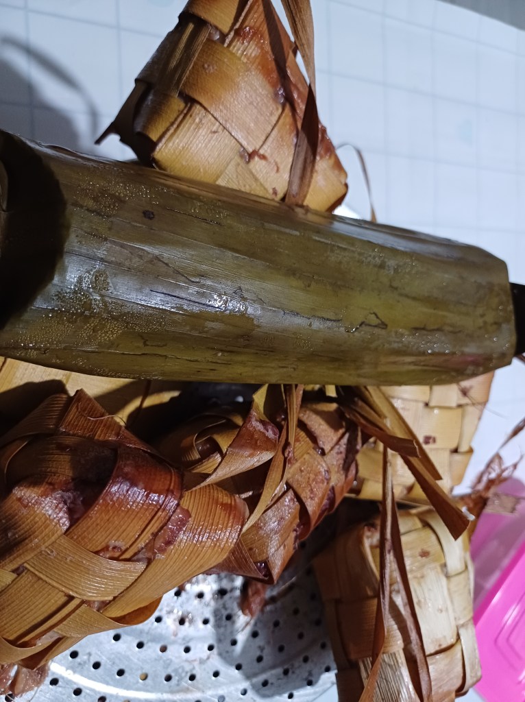 Ibu kookt een lekkere warme rijstmaaltijd met kip waar iedereen van smult. Ze maakte ook ketupat, Indonesische rijst ingewikkeld verpakt in de bladeren van kokospalm. De rijst wordt gegoten in de bladeren en vervolgens gekookt. De bladeren komen van kokosnootbomen uit de tuin van de ouders van mijn verloofde. Ketupat is een typische maaltijd voor tijdens lebaran. Ibu maakt ook een Arabische maaltijd, vanuit haar ervaring als arbeidster in Dubai. Er zijn ook samosa-gebakjes die ik mee hielp maken.